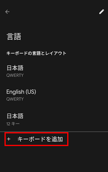 最も重要な設定項目で、「+ キーボードを追加」をタップすると日本語(12キー、QWERTY)入力だけでなく英語などの外国語を追加することや切り替えを実行できます。