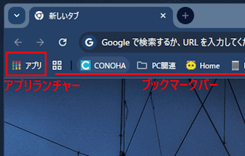 - ブックマークバー左の「アプリランチャー」アイコンをクリックします。