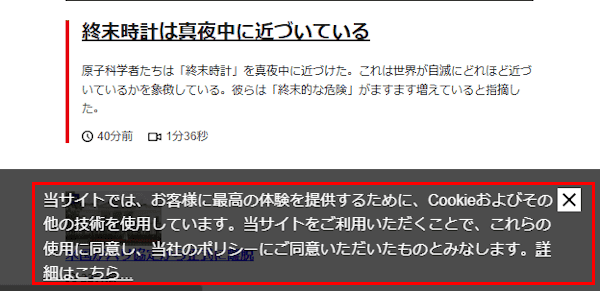 - 任意のWebサイトにアクセスして、Cookieのポップアップ ウィンドウが非表示なったことを確認しましょう。