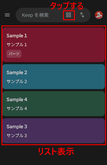 - Keepが開いてメモ一覧画面が表示されます。
