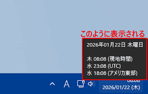 - 通知領域の日時にマウスポインターを合わせると、日本時間(現地時間)とともに追加した時計が表示されます。