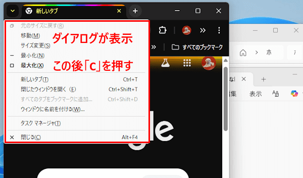2 「Alt + Space」キーを押してから「C」キーを押す