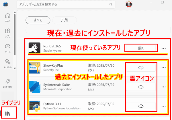 Microsoftアカウントに紐づいたコンテンツを、過去まで含めてすべてが表示されます。 - Windows 11をクリーン インストールしたときや、新しいPCに買い替えたときに「ライブラリ」を開き、再インストールしたいアプリの「雲」アイコンをクリックすれば簡単にストア アプリを再取得できます。